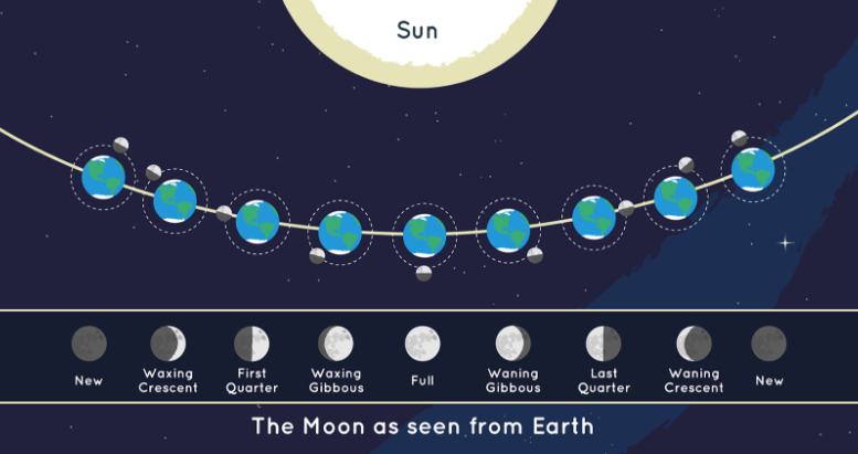 W wyniku poruszania się Księżyca wokół Ziemi i Słońca możemy zaobserwować występowanie faz księżyca. Wyróżniamy cztery: nów, pierwszą kwadrę, pełnię i ostatnią kwadrę. Każda z nich trwa około tygodnia.