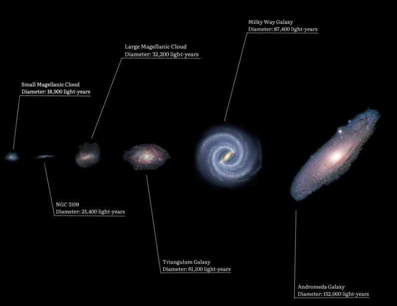 | Mały Obłok Magellana | karłowata; spiralna z poprzeczką-> nieregularna | 204 tyś. | 18 | 7 mld. | ~100 mln. | satelita Drogi Mlecznej |